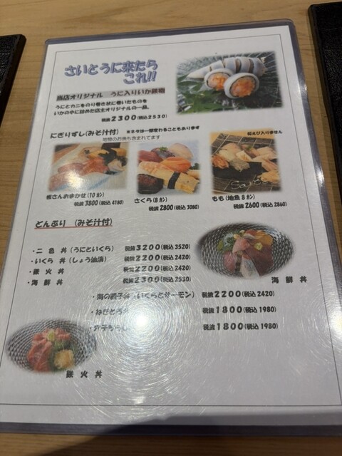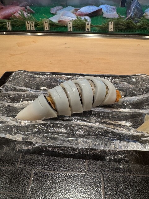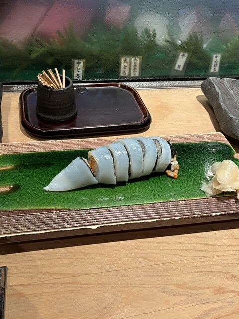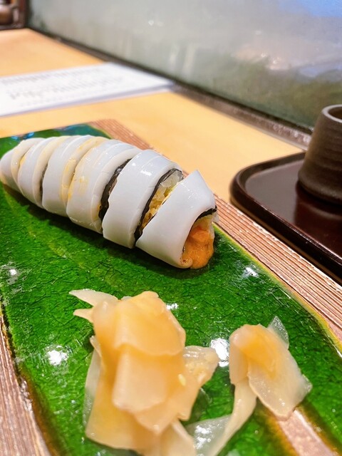 在沼津想吃海鲜时,我特意下车来到这家引人注目的寿司店,享用了〈海胆入鱿鱼炮〉的午餐。