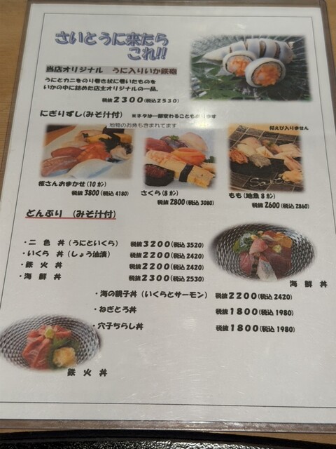 在电视和杂志上都有介绍,深受当地顾客喜爱的店铺。 沼津港的隐秘宝藏【鲜寿司斋藤】现在非常热闹。这里吸引了许多当地顾客和远道而来的回头客。我们的骄傲在于新鲜和美味,绝不逊色于其他店铺。独创的“海胆入鱿鱼铁炮”也非常美味。金目鲷和鯵的刺身更是绝品。我们还提供美味的地方酒和烧酒。店内有“本店”和“港口旬彩街店”两家分店。欢迎您来尝试一下! |