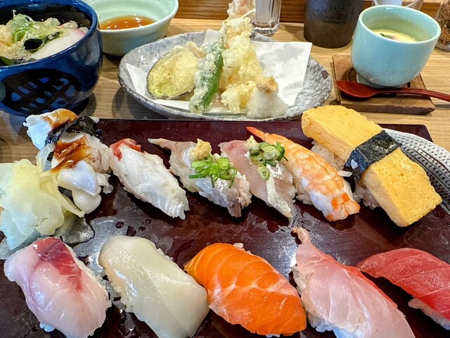 一次性体验筑地日本海的魅力!以米川水产直送的本鲔中腹握寿司和煮穴子为主的「五种握寿司和卷寿司」,搭配海鲜高汤茶碗蒸、三种时令生鱼片、炙烤嫩鸡、煮鲽鱼等共八道菜品。还包括海鲜炸物、生菜沙拉、贝汁和季节性冰淇淋,适合少人数享用,性价比极高!