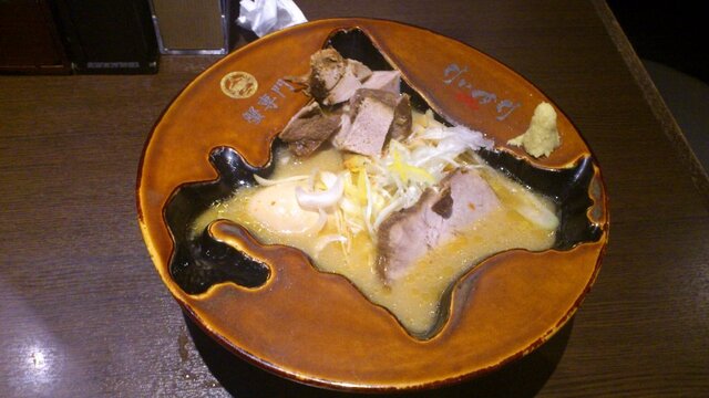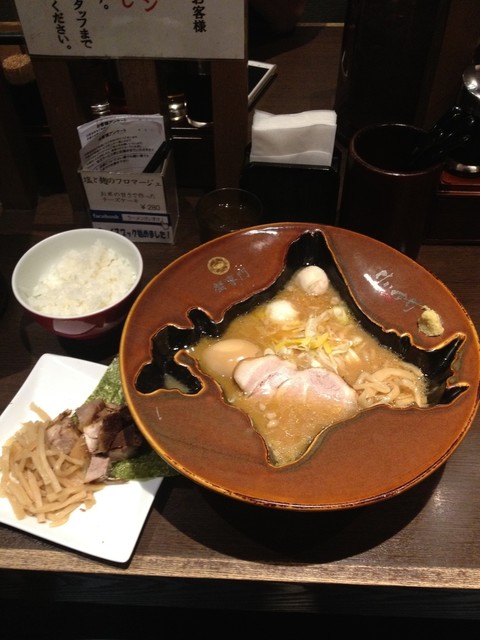 味噌拉面中的顶级选择!!! 北海道形状的碗里,盛满了丰富的配料。味道浓厚且细腻。 |