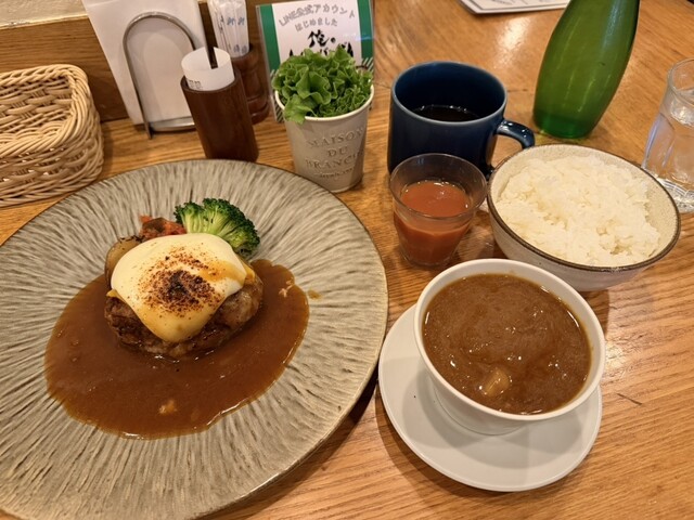 平日21:40左右到店。可能因为快关门了,客人只有大约10%。 我点了月见汉堡的俺套餐。 汤、沙拉和果汁被端上来了。 首先尝了一口汤。 嗯,甜。虽然有洋葱的鲜味,但甜味更胜一筹。光...查看详情