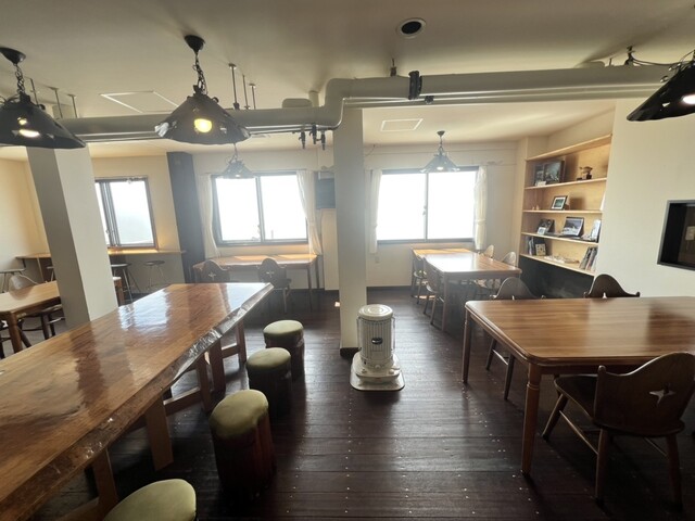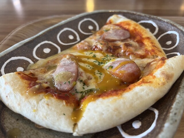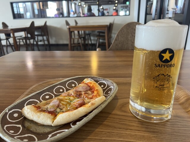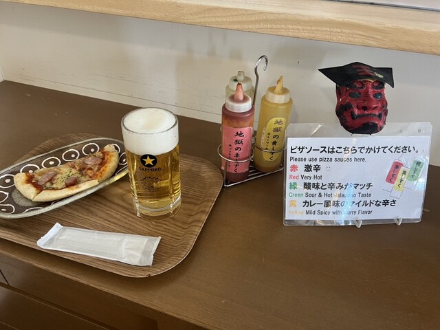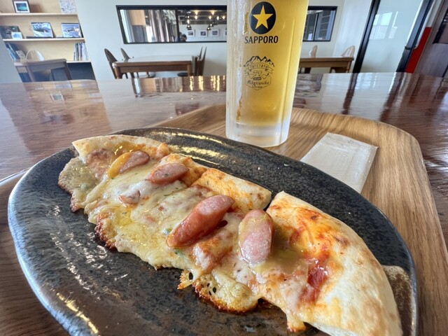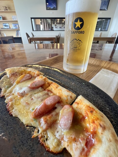 我总是在食堂和咖啡厅之间犹豫,但总觉得咖啡厅的氛围更喜欢……这次我点了恩玛的热披萨,搭配半份生啤酒。热腾腾的披萨上撒上三种披萨酱,和啤酒一起享用,真是幸福的时光……在散步或下山后,或者日归温泉时,一定要尝尝哦。