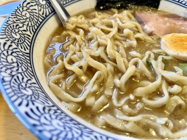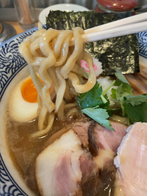 喉越しとスープの絡みが良い細縮れ麺に、こってり濃厚ですが塩ダレの効果なのか、クリーミーで飲みやすい味わいの魚介豚骨スープ。