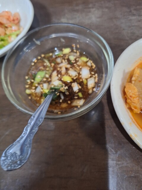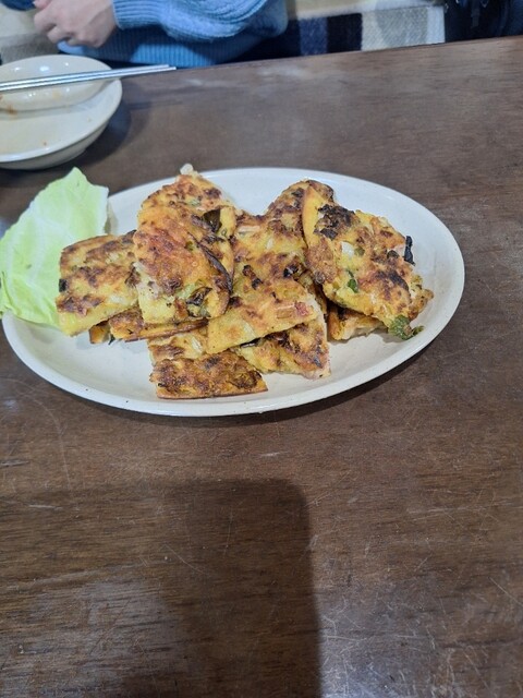 海鮮チヂミがきました。特製ネギダレで味わいます。カリッと香ばしく旨みが深みがあります。