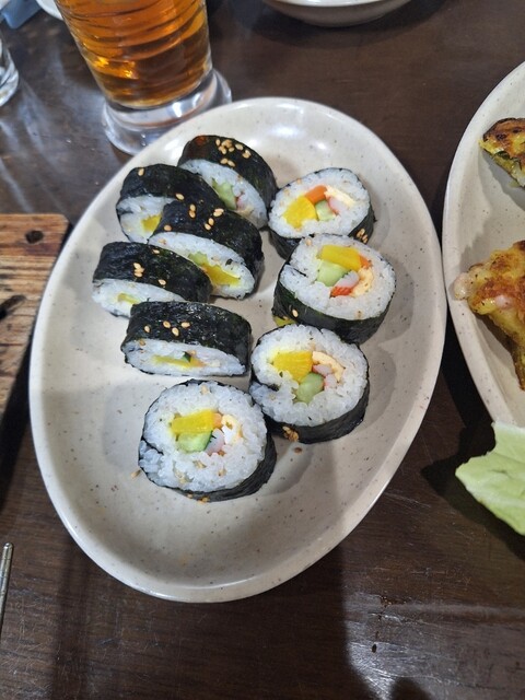 キムパがきました。沢庵、カニカマ、玉子焼き、胡瓜が入った韓国風海苔巻きで白ごまも散りばめられています。まろやかでしっとりした味わいです。