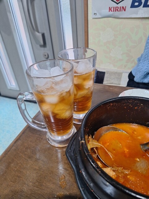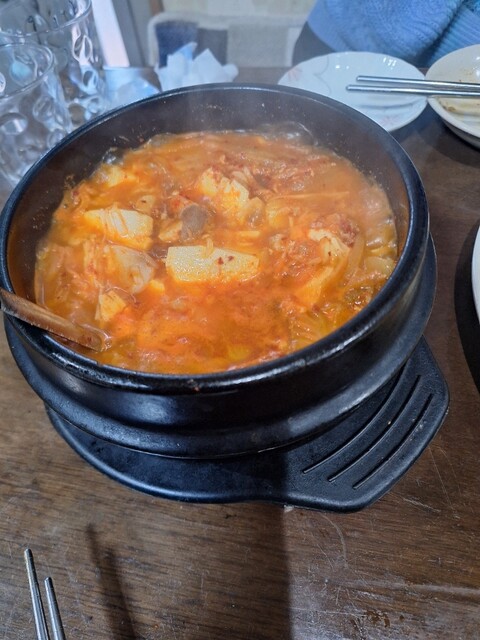 チゲ鍋がきました。豆腐、トック、白菜、ジャガイモ、大根、豚肉等が入っています。ピリ辛で旨みが良く味わい深い。相方も具材の旨みを喜んでいました。