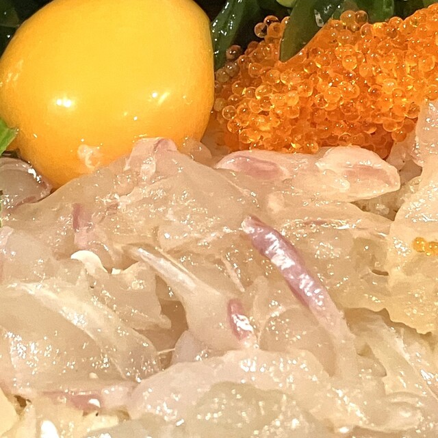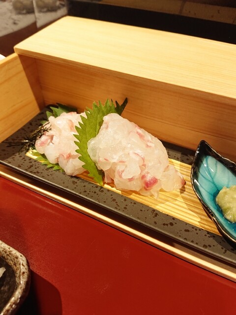 鯛の皮と鯛の身を薬味と一緒にポン酢で