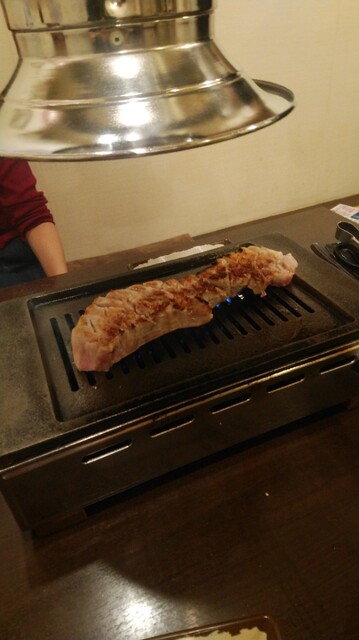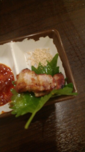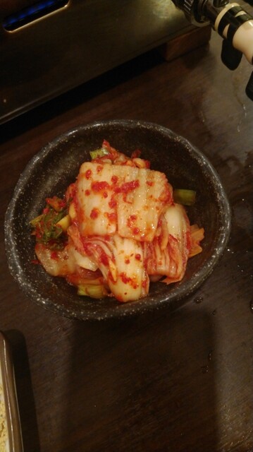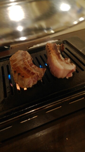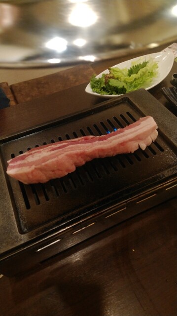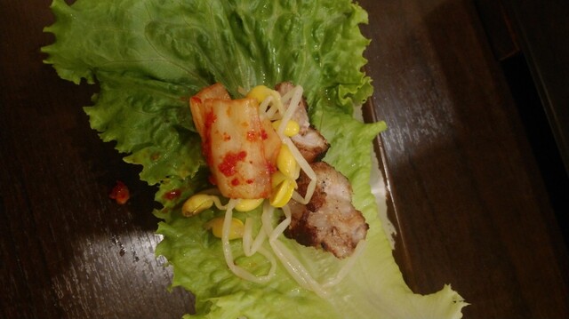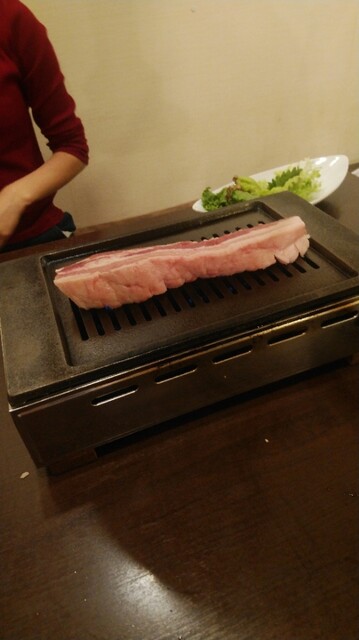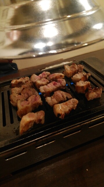 サムギョプサルがきました。目の前で店員さんが豚肉の塊を焼いてくれます。最後はハサミで細かく切ってくれます。チェシャや大葉、もやしナムル、白菜キムチも出てきました。チェシャや大葉に豚肉と白菜キムチ、もやしナムルを入れて包みコチジャンなどにつけていただきます。チェシャであっさりと味わえます。また大葉は独特の風味がありました。コチジャン以外にもあっさりしたタレや黄粉などもありいろいろ楽しめました。相方もチェシャであっさり食べれて良いと喜んでいました。