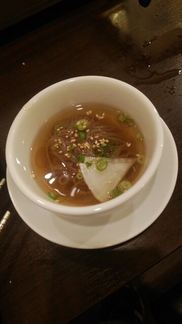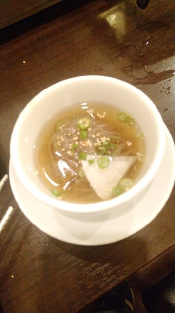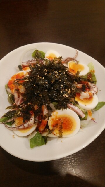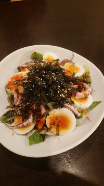 最初にチョレギサラダがきました。野菜にイカゲソ、ゆで卵スライスなども入っていて上には刻まれた韓国海苔に白胡麻が乗ってます。ピリ辛な味付けでシャクシャクいただきました。相方もピリ辛でそこまで辛くなくておいしいと言っていました。