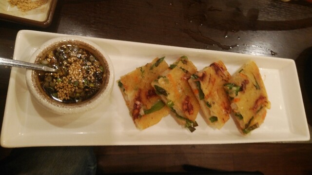イカゲソチヂミ、フンワリふっくらしていてサクッとした口当たりです。イカゲソの旨みも味わい深い。相方もフンワリしていておいしいと言っていました。