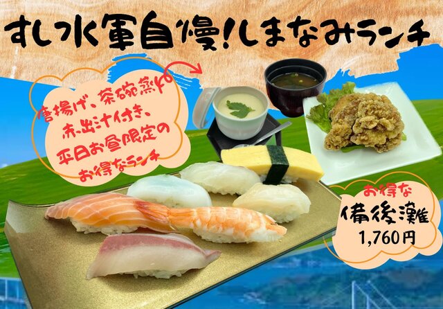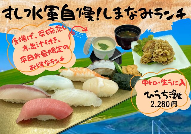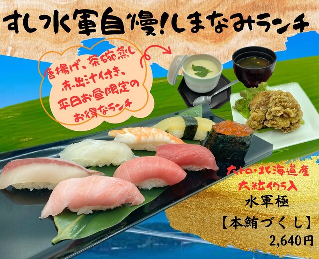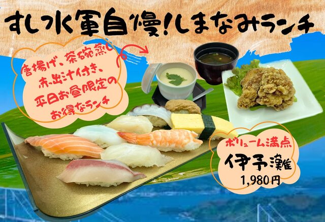 すし水軍は水産会社直営の本格寿司。全国各地から新鮮で安全・安心な国産水産物や 来島海峡の漁師さんから 毎朝地魚を仕入れ、常に旬のものを豊富に取り揃えています。 また、職人の手握りにこだわり、一貫一貫心を込めて握ります。