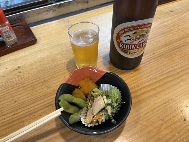 瓶ビール(勿論、スーパードライ)、バーベキュー串、イカ刺身、鰻を注文。イカの刺身が新鮮。味わっていると、バーベキュー串が到着。肉はジューシーでビールがよくあう。そのあと、鰻も到着。... 詳細を見る