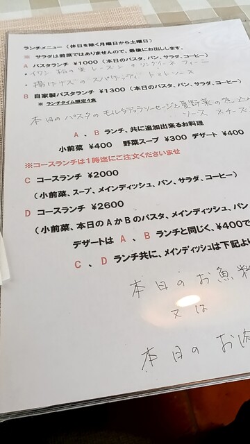 パスタランチを注文しました。パスタ・パン・サラダ・ドリンクというシンプルなセットでしたが、それぞれにシェフのこだわりが感じられ、とても満足しました。小さなお店なので、事前に予約した方が確実かもしれません。
