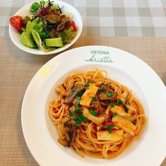 ツレが 蛸のミンチのトマトソースパスタ。