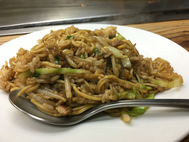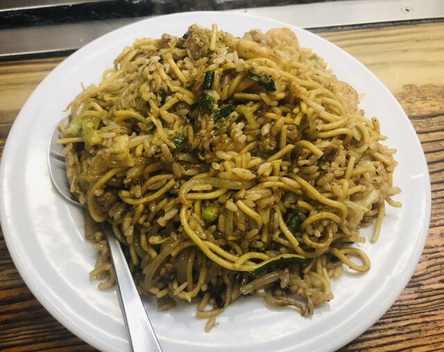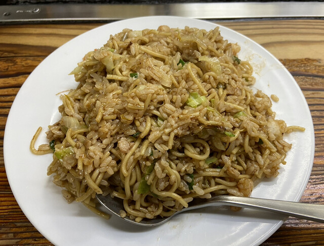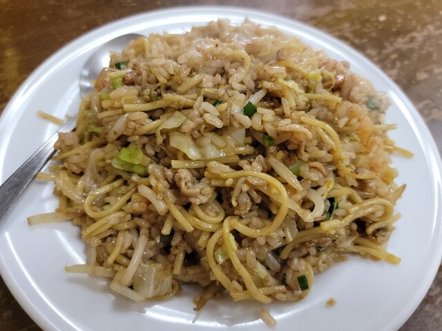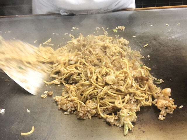 焼き飯と焼きそばを豚肉に合わせて炒める。