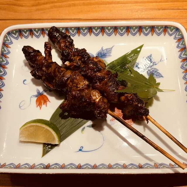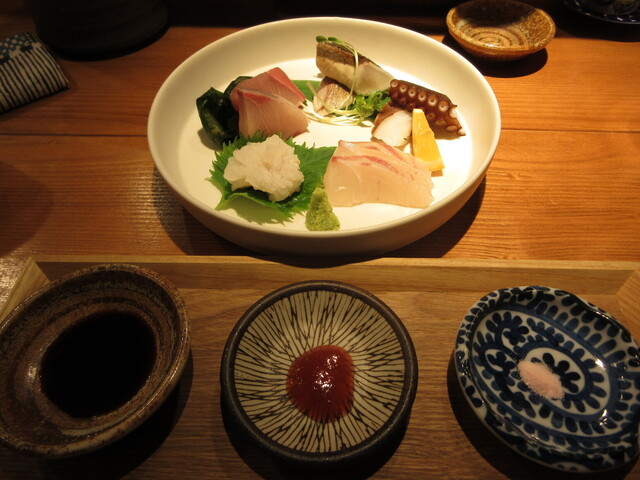 肴は…シャインマスカットの白和え、お造り五種盛り(秋鰆、真鯵、カジキまぐろ、真鯛、太刀魚)、鰻の肝串、真鯛のカマ焼き、