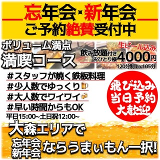 For Okonomiyaki, try the "Uma Yoko" all-you-can-drink course, perfect for parties and gatherings! With 86 seats and a spacious parking lot!
