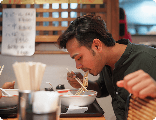 When eating noodle dishes like ramen, soba or udon, it's perfectly fine and even encouraged to make slurping sounds. It's seen as a sign that you are enjoying your meal, can help cool off piping hot noodles, and is even said to enhance their flavor!
