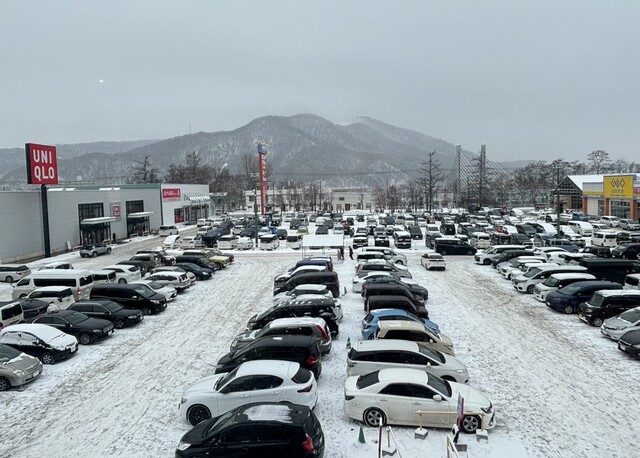 Once seated, you can enjoy a view of the parking lot and Mt. Moiwa through the round windows.