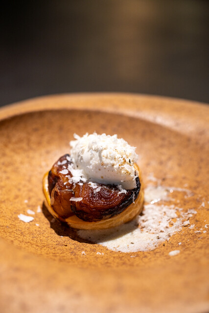 The onion pie, warmed and sautéed with butter and topped with parmesan cheese ice cream, i...View details