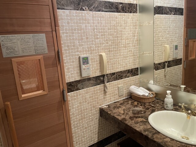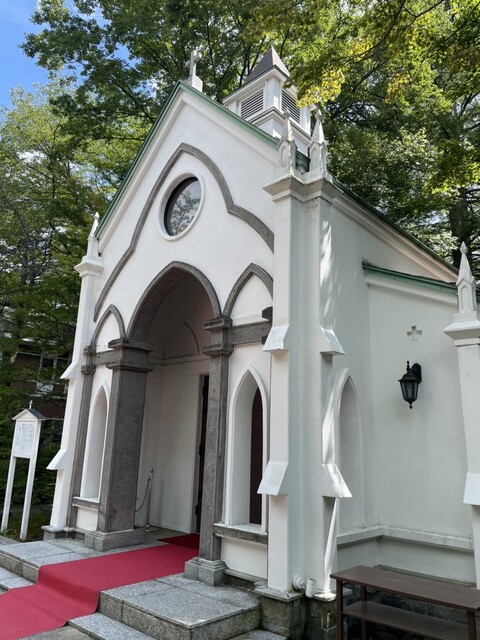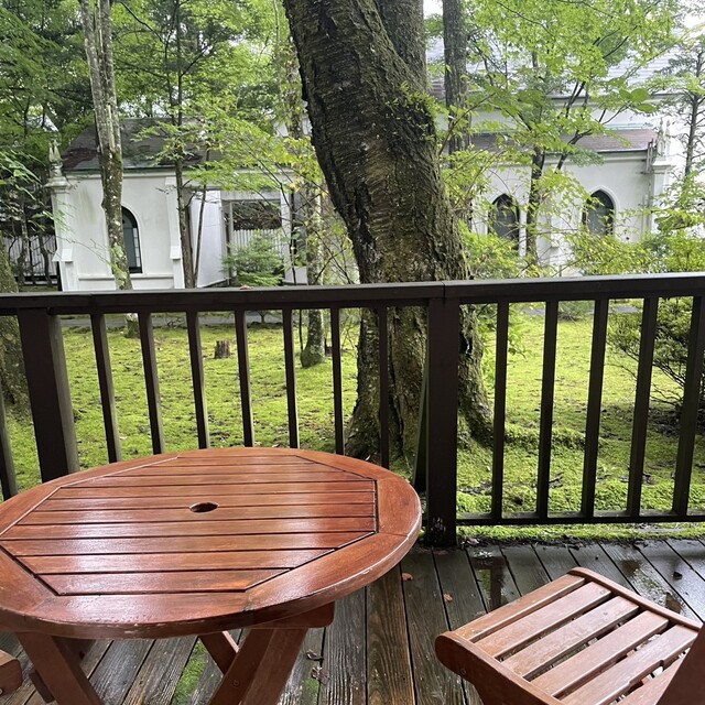 The room was fantastic. It faced the courtyard and had a terrace offering a side view of the iconic church, surrounded by greenery. There was even a sauna, although it was meant for one person. The bathroom was equipped with a jacuzzi, and the furnishings were quite sumptuous, truly capturing the vibe of a Karuizawa villa. While owning a villa would be nice, the upkeep can be quite challenging; given that you can enjoy a room like this for JPY 200,000 a night, it may actually be more cost-effective than owning a villa.