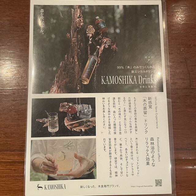 The cocktails featured here all contain drinks made from extracts of wood. I even got to taste this "Kamoshika" beverage, which has a distinct woody aroma. Speaking of which, I remember purchasing a similar wood extract during my trip to Canada but never figured out how to use it. This experience gave me some great ideas on how to incorporate it.