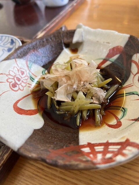 The pickled wasabi stems were delicious, topped with bonito flakes. The moderate spiciness and texture were fantastic, making it a great pairing with the sake.