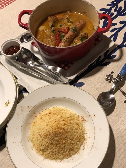 Anchovy Toast, Cassoulet, Seafood Gratin, and Couscous. White and...
