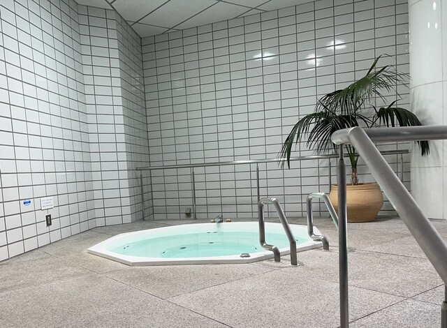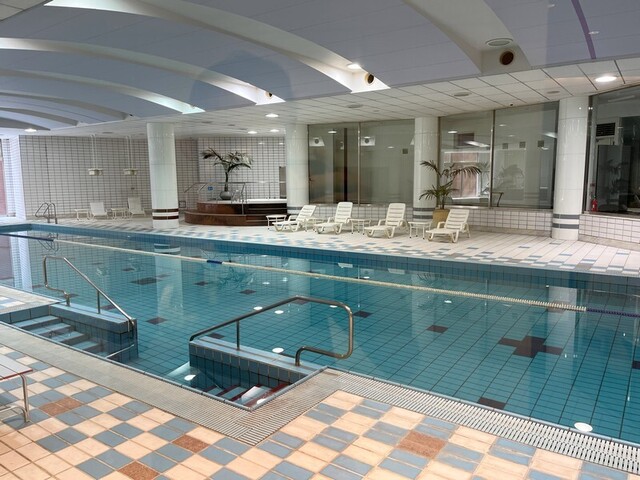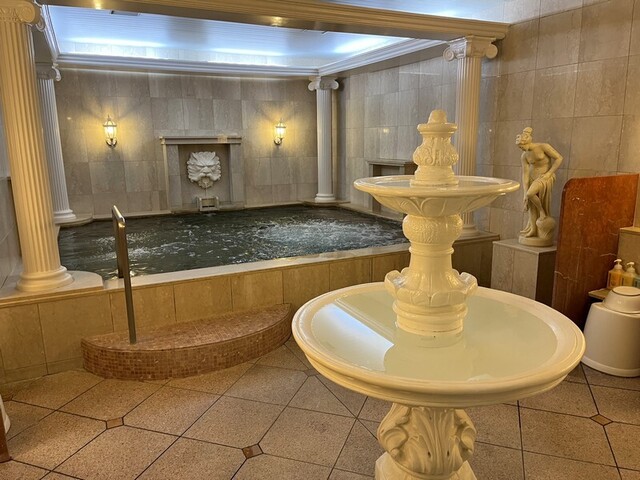The hotel facilities include a pool, sauna, and Roman-style bath (large communal bath).