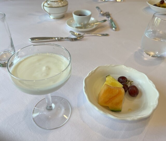 ● Blancmange made from Wakakusa tea from Tenryu Village, served with cherry gelato and grapefruit sorbet.