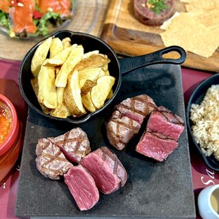 • Horse Meat Tartare with Yuzu and Two Types of Cheese • Shinshu Salmon and Smoked Nut Salad • French Fries • Two Types of Steak Strip Loin 100g Shinshu Alps Beef Inside Round 100g • Teppan Garlic Rice • Crème Brûlée The main steaks will be served on a hot stone. |