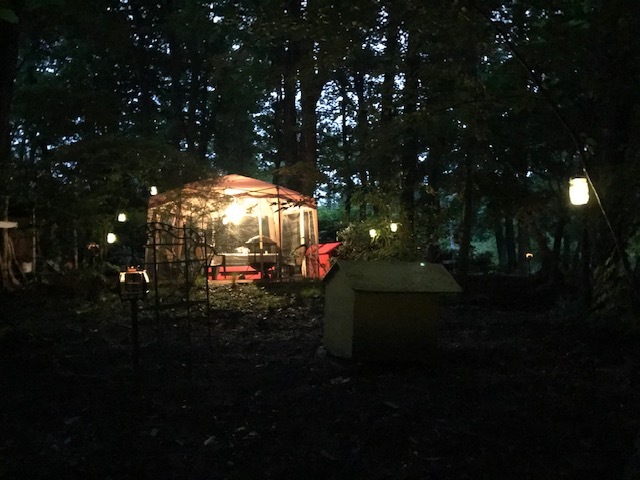 Pets can sit on the terrace, in the shade of the forest, or in a hut with a lamp. |