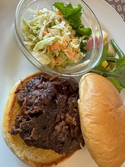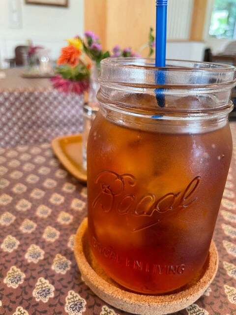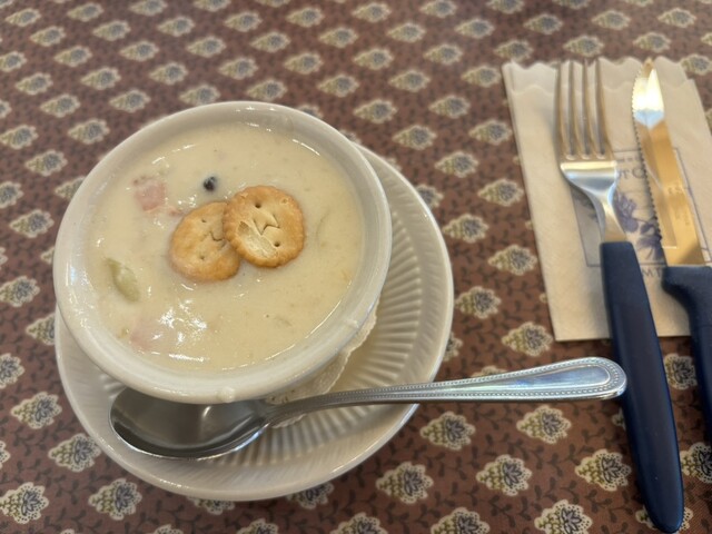 I had pancakes, French toast, waffles, coffee, cabin coffee, hot tea, and today's soup (clam chowder...
