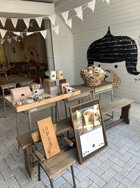 As I entered, the spacious kitchen, reminiscent of a small factory, showcased a variety of donuts being made. Venturing further inside, I found an array of old-fashioned donuts along with cute merchandise featuring the store's characters. There's also a lovely eat-in space set up with school desks and chairs in the courtyard.