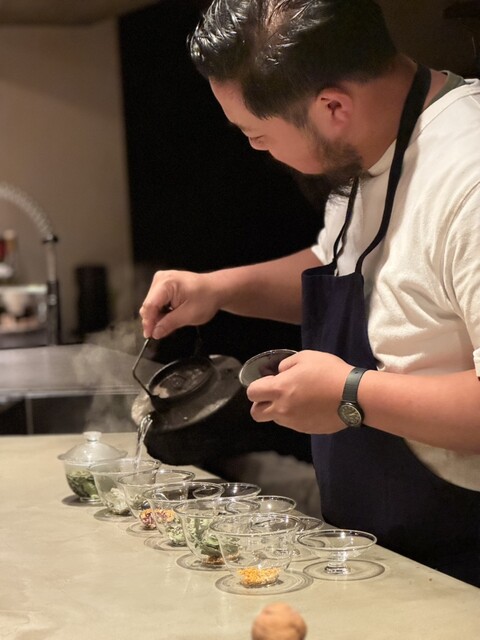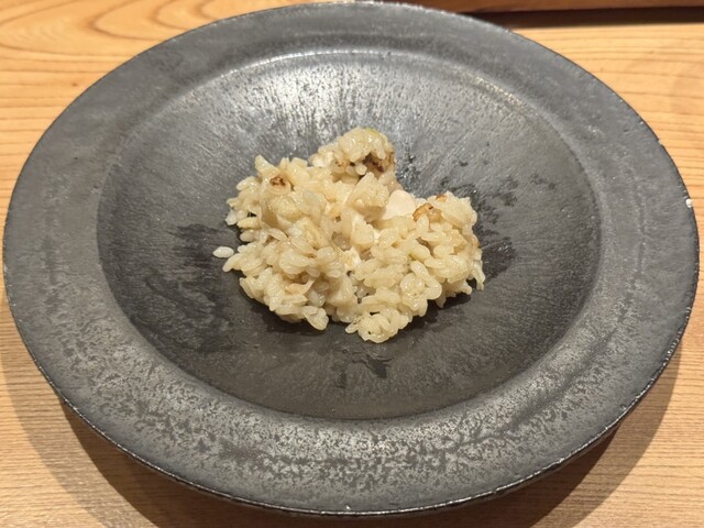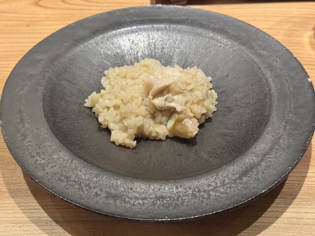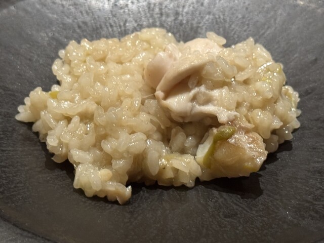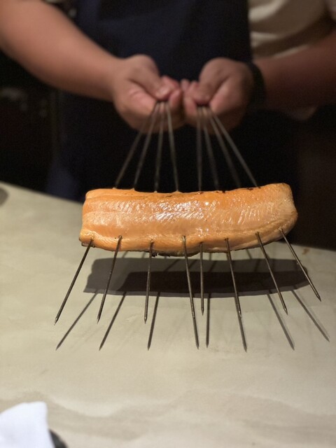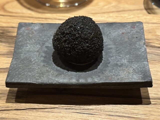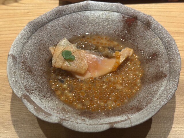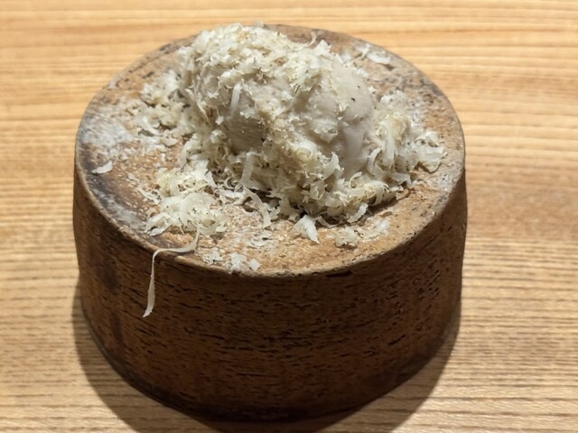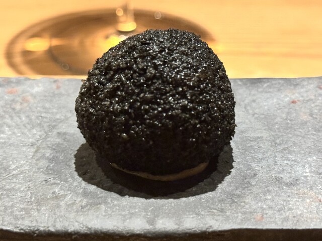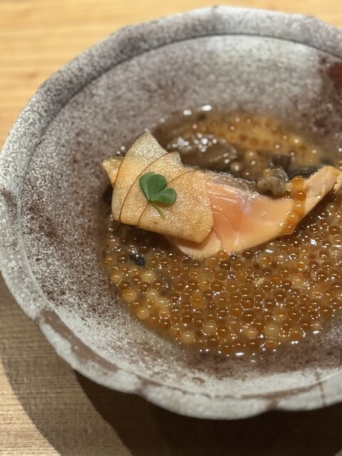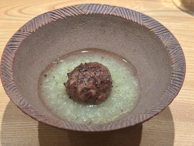 The wild bird meatballs with green daikon are made from pheasant and duck, finished with grated kiwifruit. They have a meaty texture with a hint of Japanese flavor, and I really enjoyed them with the paired wine. The contrast of aroma and taste, along with the pairing, was delightful.