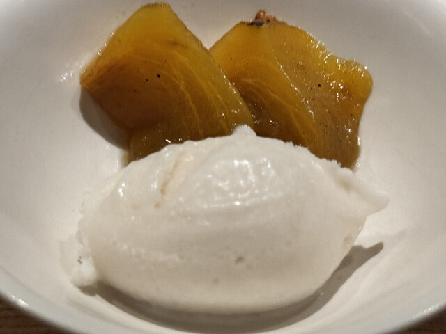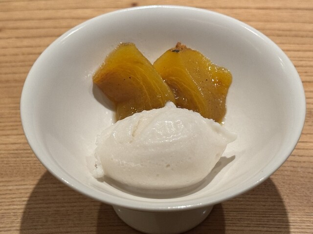 The grilled persimmon with sweet sake has a wonderful texture and sweetness, with the sweet sake served as ice cream.