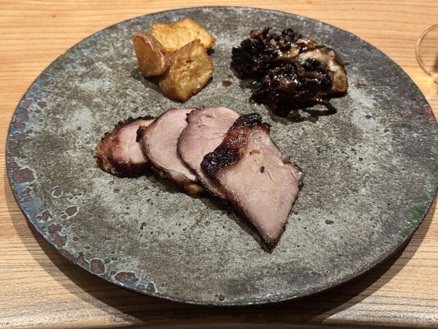 The wild boar with maitake mushrooms and soy sauce koji is a char siu-style dish cooked with soy sauce koji. The maitake sauce is reduced with wild boar bones and port wine. The potatoes are seasoned with a spice called Wuxiangfen, which tastes like cinnamon and is delicious. The pairing was with a wine that has sherry barrel notes, which complemented the spice elements well.
