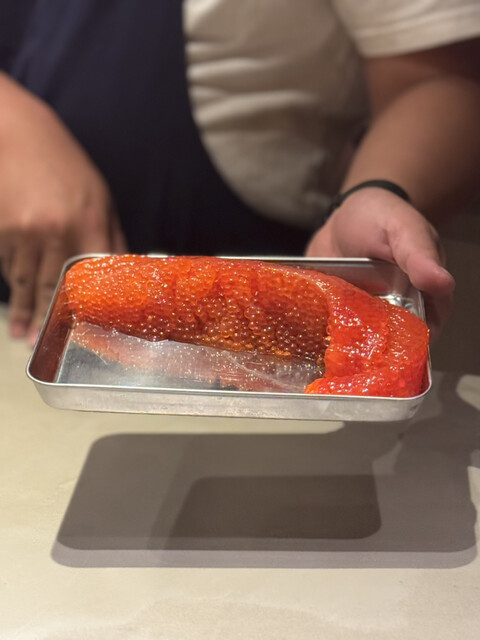 The trout roe with wild mushrooms is served in a broth made simply by boiling naratake and amitake mushrooms in water, with the roe cooked just enough to maintain its texture. There’s an incredible amount of roe, which brings immense joy to eat.