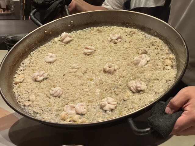 Arroz con bacalao y puerros features cod soft roe and leek paella, cooked with clam and razor clam broth. The presence of the leek was stronger than I expected. The pairing was surprisingly with Meursault.