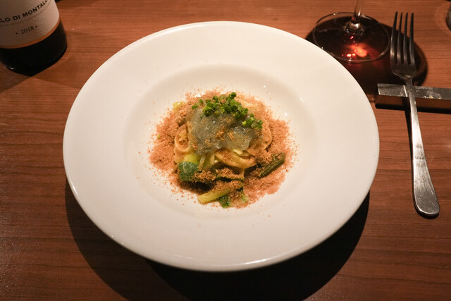 Nestled just a short walk from Hiroo Station, "Bottega" quietly awaits beyond the hustle and bustle of the city. As you open the small door and descend the narrow staircase, you'll find a refined yet ...cozy "adult hideaway." Chef Sasakawa, who has honed his skills in Italy and boasts over 20 years of experience, continuously evolves his delicate processes driven by an insatiable curiosity, never sticking to a fixed recipe. Each special dish created by this Michelin-starred chef is filled with a unique story, reflecting the one-time encounter with that day's guests.