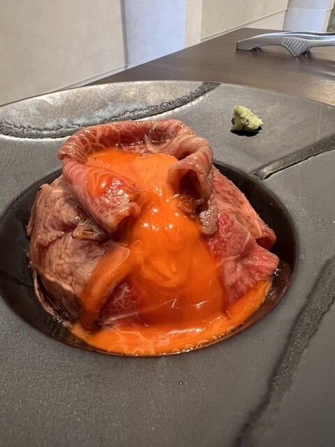 Slightly seared marbled Wagyu pairs perfectly with rich egg yolk!