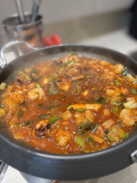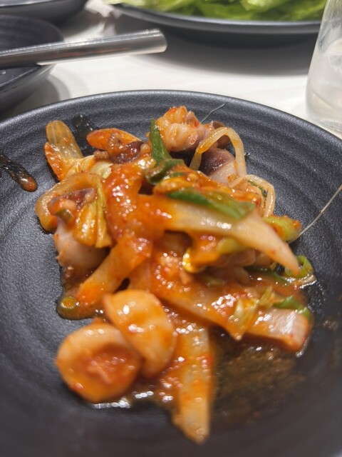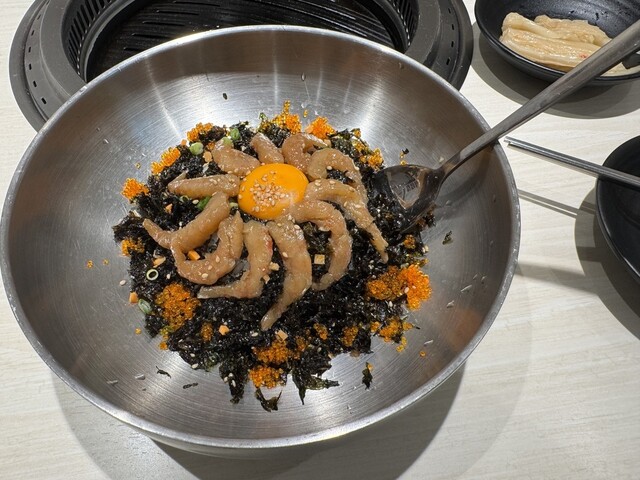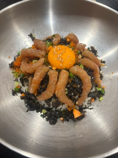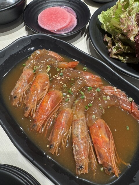 This restaurant is famous for its Samgyeopsal, but I couldn't resist ordering the Kanjang Saeu Bibim...
