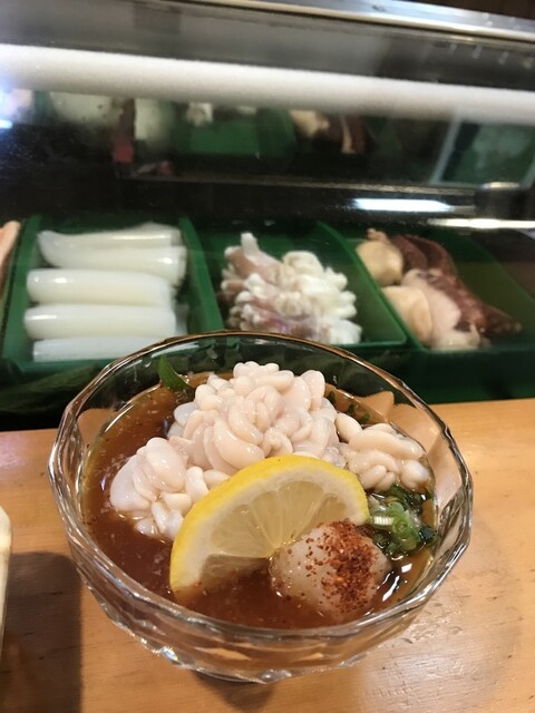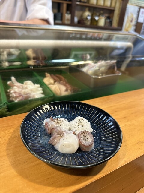 内装はいわゆる町の上品目なお寿司屋さん。カウンター席のみっぽい感じ。生ビールを飲んでいると、突出しが。三つの小さな小鉢にマグロとイクラの大根おろしあえ、酢味噌の和え物、白身魚のポン酢和えが。結構な量で、しかも酒に合っておいしい。お刺身の盛り合わせを頼むと、中ト...