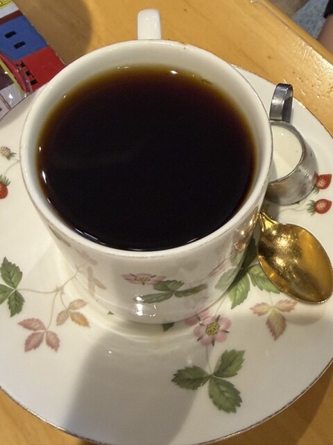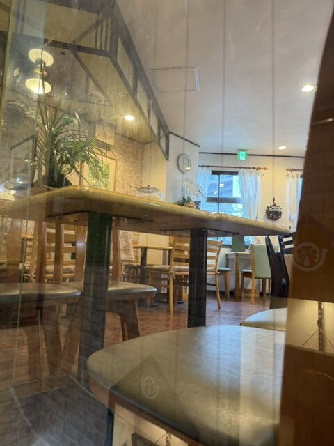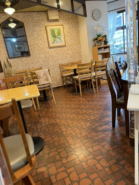 階段をの懐かしい感じの喫茶店で、ショーケースの中には美味しそうなフルーツケーキが並んでいます。お店は4人掛けのテーブル4つと6人掛けのテーブルがありました。