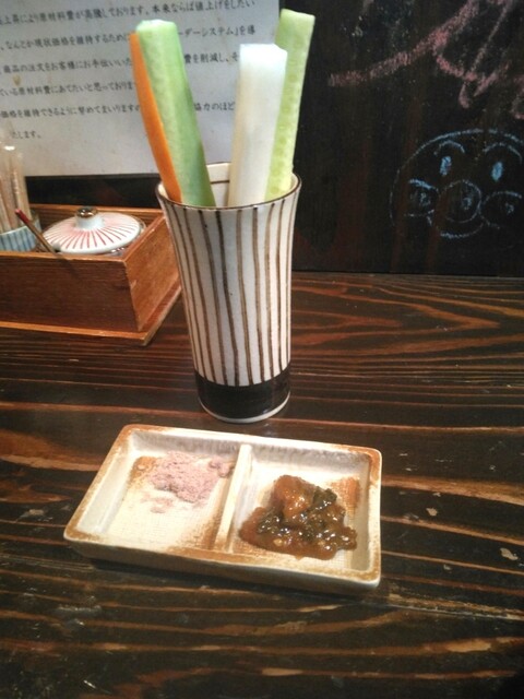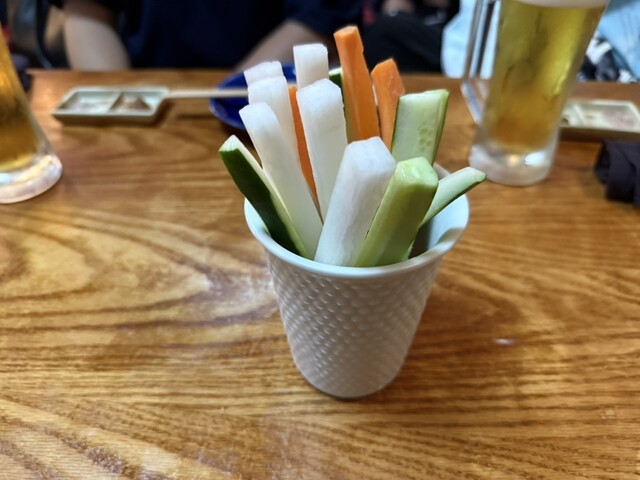 飲み放題も頼んでいたので、ビール飲んでたら付き出しの野菜スティックが来ます