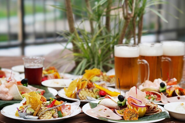 3密を回避するオープン・エア。人数制限と検温消毒。個別料理で安心。90分間飲み放題付き。