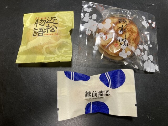 和菓子の、近松物語(PUMPKIN PIE)、越前漆器(和洋菓子)、和生菓子の越前焼(どらやき)