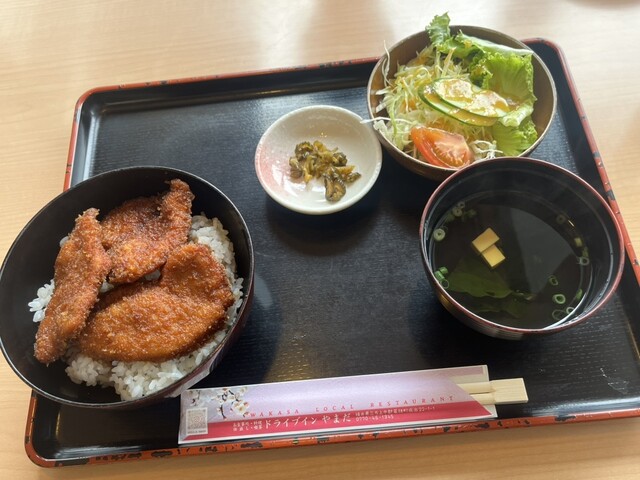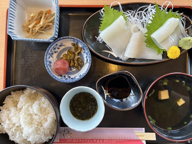 福井県は若狭町、三方湖の南側にあるお店です。こちらのお店では、海鮮丼や刺身定食、イカ刺身定食などの海鮮メニューが豊富に揃っている他、ソースカツ丼などのガッツリ系のメニューも人気です。本日はお昼ご飯にてお邪魔しました。
