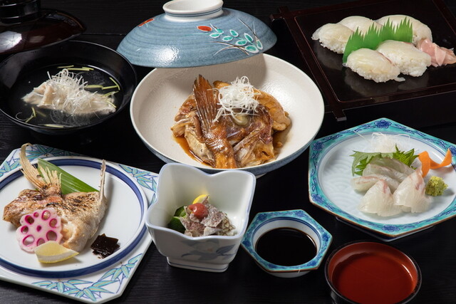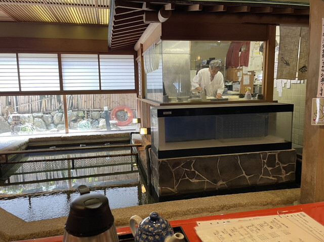 店内の大型いけすには若狭産の活魚が群泳しています。お客様の注文をお聞きしてから目の前で調理をさせて頂いております。おこぜ、皮はぎ、あわび、鯛、ふぐ、かに等、全て若狭の海でとれた活魚をリーズナブルなお値段で食べて頂けます。子供からお年寄りの方まで幅広いお客様に喜ばれております。