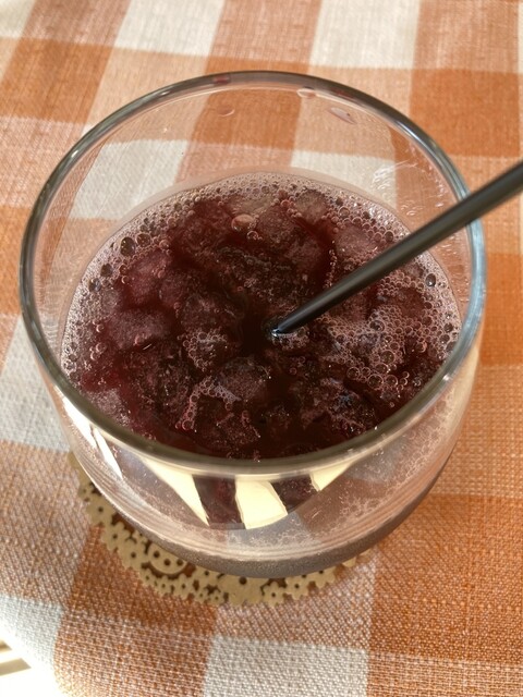 大粒ブルーベリーワッフルのハーフ1800円とワイナリーのぶどうジュースの赤、セット料金で300円、連れは、カフェラテ550円をオーダー。